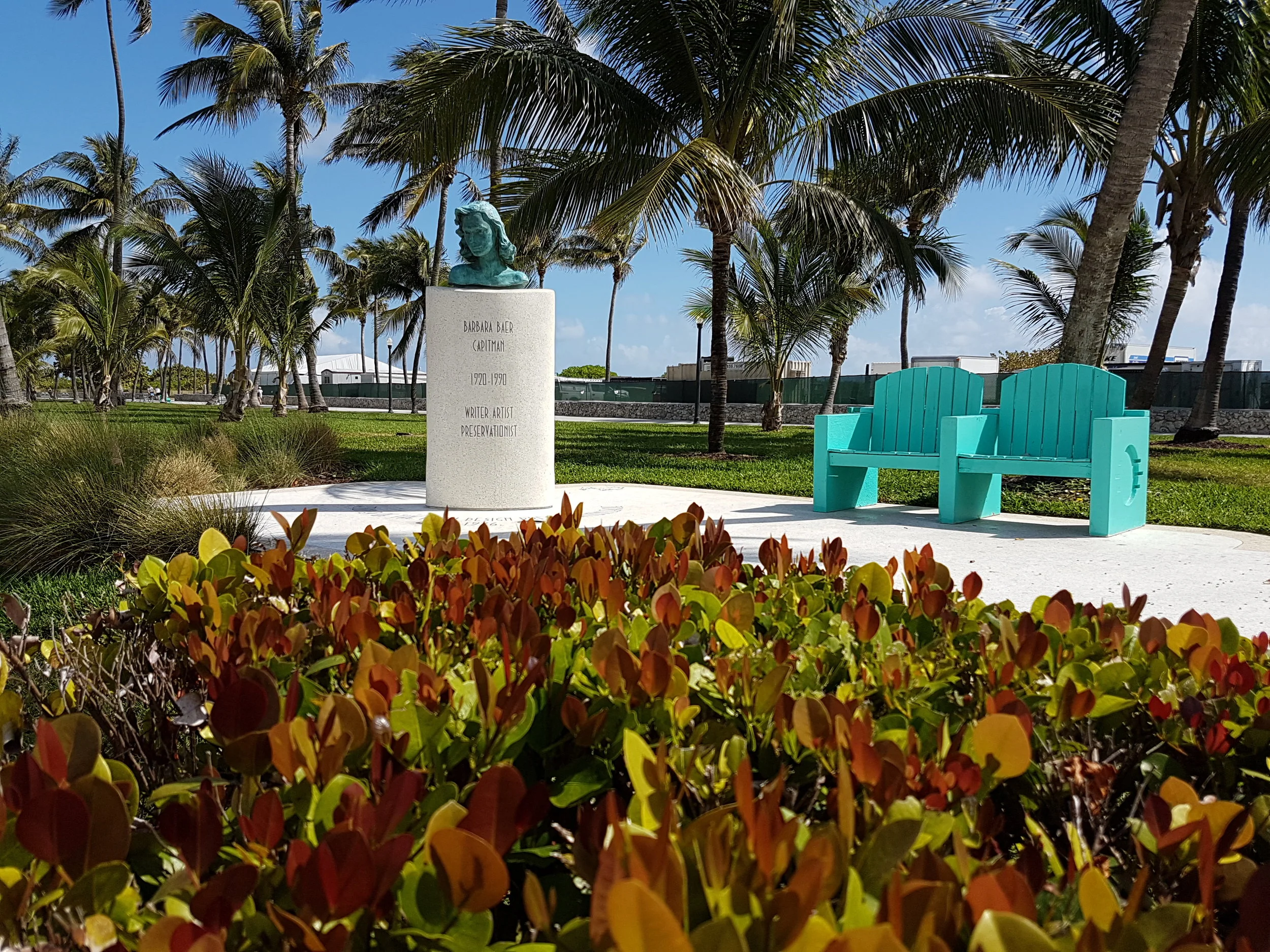 As you stroll down Ocean Drive today, you are surrounded by buildings that take you back in time. Tourists snap photos of everything in sight. Restaurants are blocked with customers. The whole scene is pulsing with energy. On the beach side of Ocean Drive, though, you’ll find a quiet place with a couple of bright green wooden beach chairs. It’s a memorial to Barbara Baer Capitman who died in 1990. There's a very simple bronze bust from a sculpture of Capitman by her mother that was done in 1939 when Barbara was 19 years old.